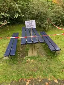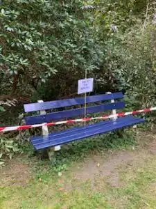 Zaterdag begonnen we wat later vanwege het vochtige weer. We moesten nog 2 banken schuren en alles schilderen. De schilders waren zaterdag klaar met schilderen voordat de schuurders de bankjes geschuurd hadden. Dus moest er even gewacht worden! Ondertussen plaatsten we alvast de bordjes “Pas op! Pas geverfd.”